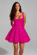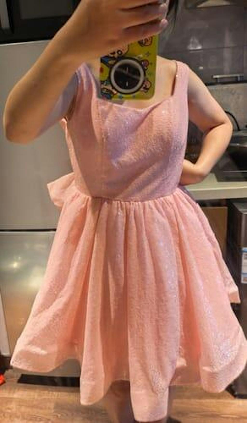 Featured: Steal the spotlight in this pink A-line dress that’s equal parts sweet and glamorous. The wide straps and flattering square neckline highlight the collarbone and bust, while the fitted bodice sculpts the waist for a feminine silhouette. A voluminous flared skirt creates a twirl-worthy finish, and the oversized bow detail at the back adds a touch of whimsical charm. The allover sequin accents ensure a radiant glow with every movement, making it the perfect blend of cute and chic.