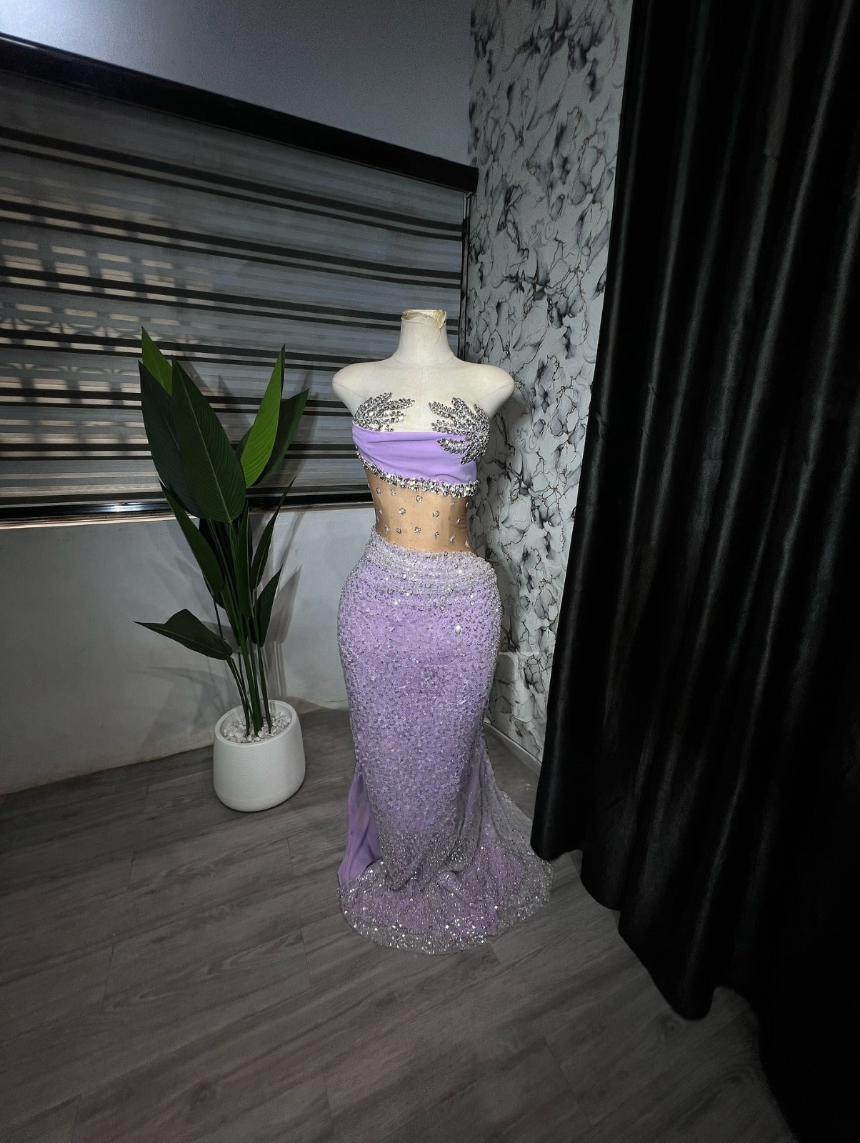 Elevate your prom night with this stunning purple mermaid gown that commands attention. The strapless silhouette showcases an elegant neckline, while intricate beading and glitter detailing create a mesmerizing sparkle with every movement. The fitted bodice flows into a dramatic fishtail hem that captures the essence of timeless glamour. Crafted for the sophisticated prom-goer, this long dress combines classic mermaid styling with contemporary embellishment for an unforgettable entrance.