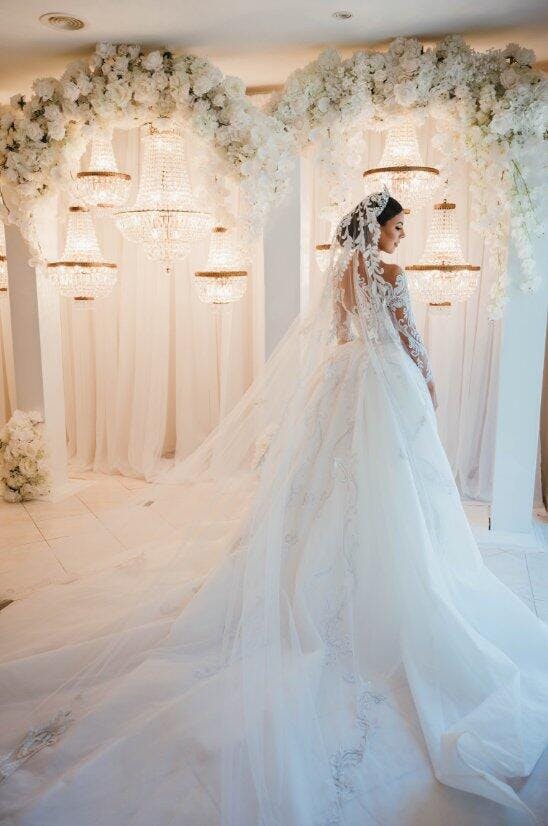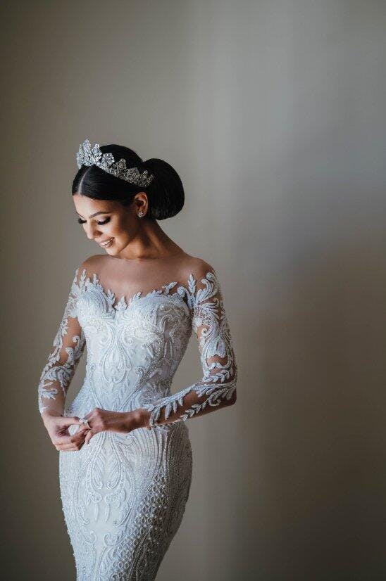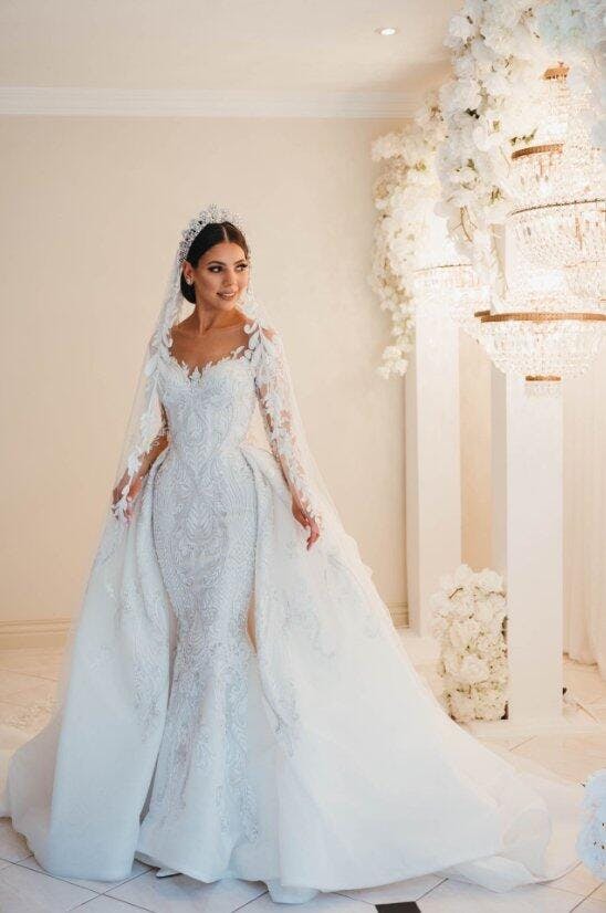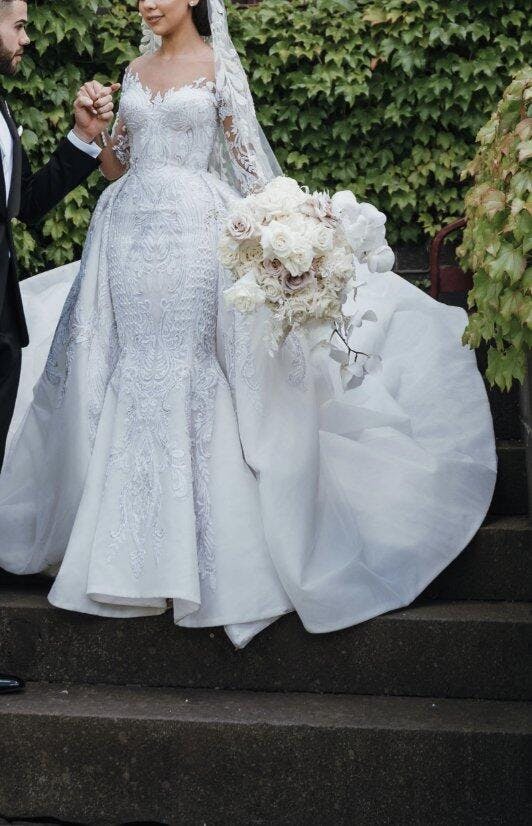 Cette robe de mariée sirène d'une élégance intemporelle est ornée de dentelle blanche délicate et de manches longues. Sa traîne amovible offre une grande polyvalence, vous permettant de passer avec fluidité de la cérémonie à la réception. Conçue pour sublimer votre silhouette, elle allie luxe et confort, ce qui en fait le choix idéal pour une mariée en quête de sophistication et de grâce pour son mariage.