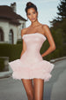 Featured: Turn heads in this dazzling light pink mini dress made to steal the spotlight. The strapless ruffled neckline adds a flirty, feminine touch, while the tiered design enhances your shape with a flattering fit. The ultra-short skirt shows off your legs with confidence, while the sleek bodycon silhouette sparkles under the light for a glamorous, red-carpet-worthy look.