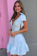 Featured: Step into the spotlight with this white mini dress that radiates youthful charm and sparkle. The flattering V-neckline and fitted A-line silhouette are enhanced with dazzling beaded embellishments, while the ruffled hem adds flouncy movement to every step. Delicate bow tie straps bring a playful, feminine touch, and the backless design ensures a striking exit and adjustable comfort. Perfect for homecoming, parties, or any night meant for dancing, shining, and turning heads.