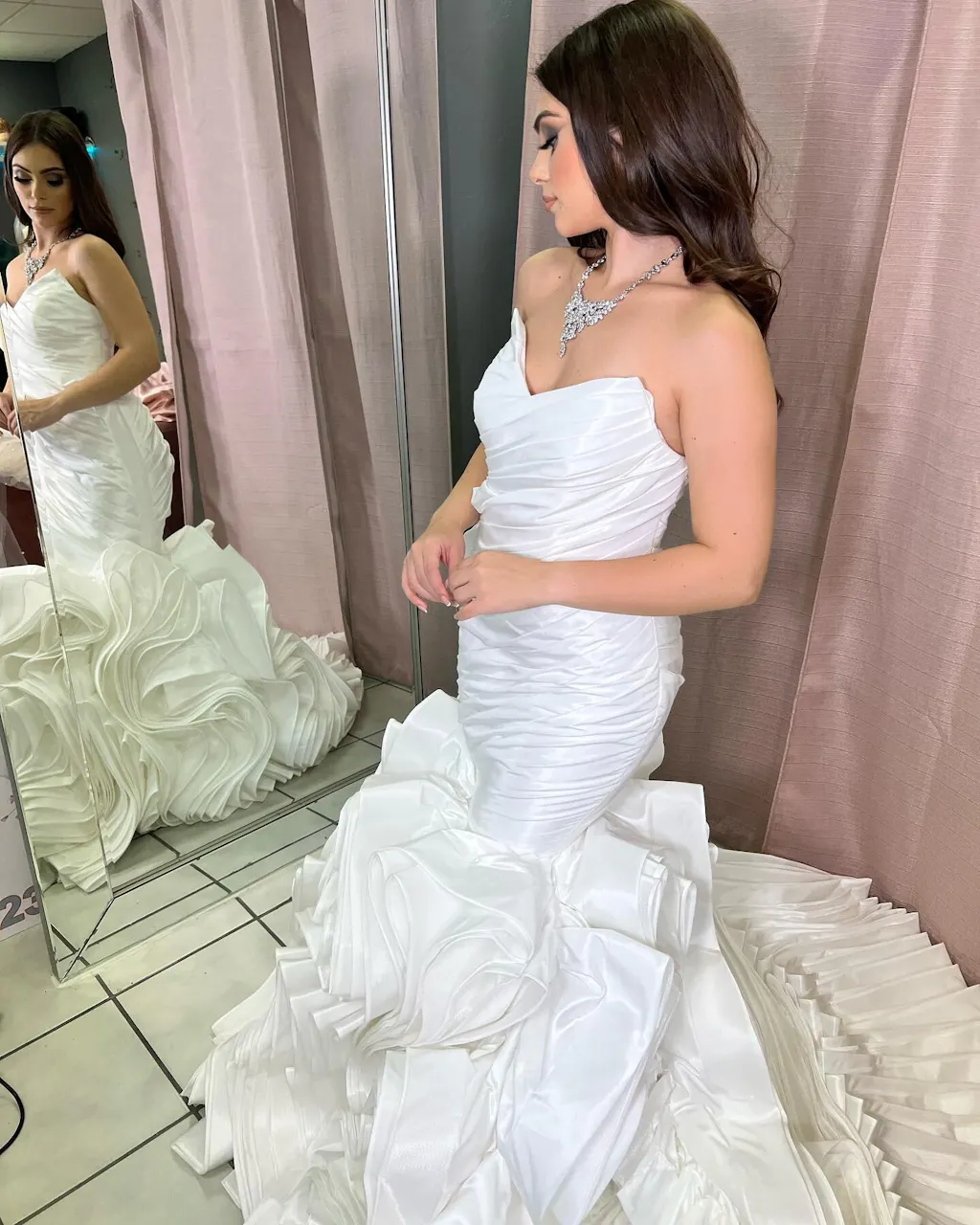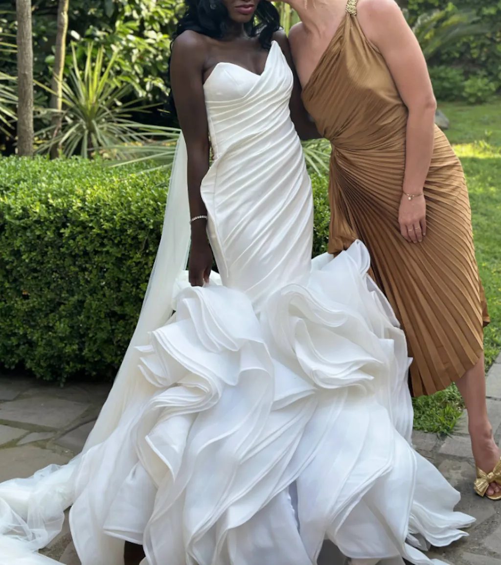 Faites une entrée remarquée et élégante dans cette robe de mariée sirène bustier à couper le souffle. Confectionnée en organza luxueux et ornée de délicates finitions passepoilées à plusieurs niveaux, cette robe est un chef-d'œuvre de la haute couture nuptiale, conçue pour vous faire sentir comme une reine.