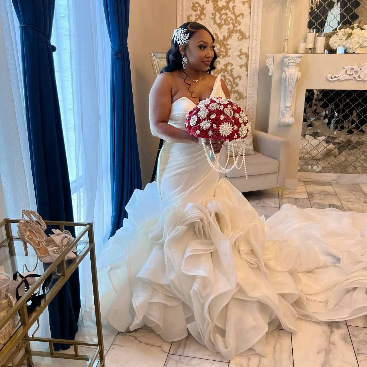 Cette somptueuse robe de mariée sirène bustier est confectionnée en organza luxueux et ornée d'un délicat passepoil à volants, ce qui en fait une pièce intemporelle et absolument magnifique. Le passepoil à volants dessine une silhouette sublime qui ne manquera pas d'attirer tous les regards et de vous faire sentir comme une princesse des temps modernes le jour de votre mariage.