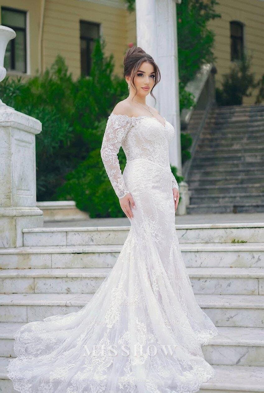 Timeless elegance meets modern romance in this stunning off-the-shoulder mermaid gown. Crafted in pristine white, the dress features intricate lace detailing that cascades gracefully across the bodice and down the elongated silhouette. The off-shoulder neckline creates a sophisticated, romantic frame for the face, while the mermaid cut hugs the body before flowing into an ethereal train. Perfect for brides seeking a dress that balances classic bridal tradition with contemporary allure. Customizable to your measurements for an impeccable fit on your special day.