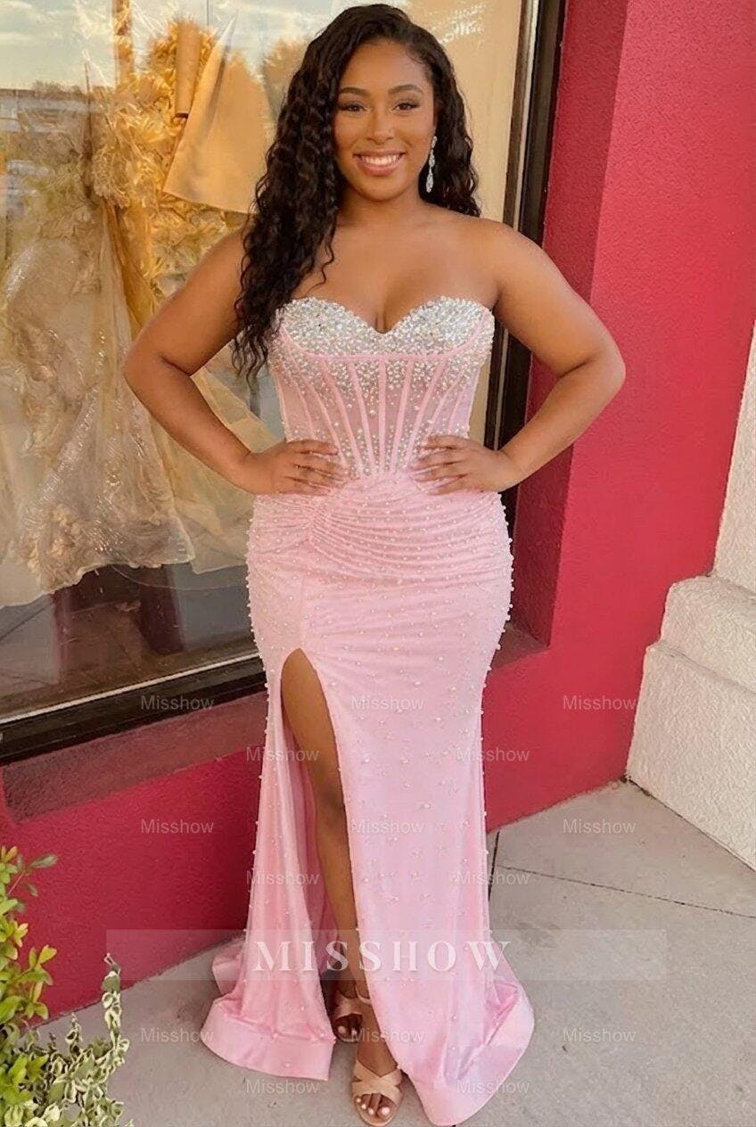 Product Description Make an unforgettable entrance in this exquisite mermaid gown. The strapless bodice elegantly frames the shoulders, while lustrous pearl detailing adorns the silhouette with refined sparkle. A tasteful side slit provides graceful movement without compromising the dress's dramatic floor-length silhouette. The luxurious pink tone radiates sophistication and pairs seamlessly with classic or contemporary styling. Designed for the discerning prom-goer who values both timeless elegance and modern edge—this gown delivers red-carpet presence with understated confidence.