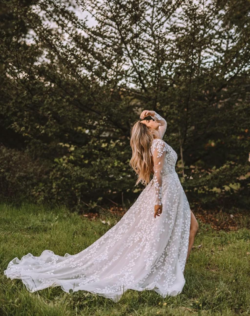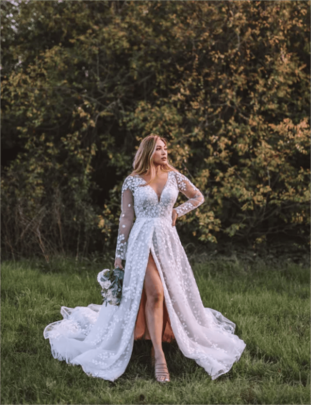 Elevate your wedding day look with our Beautiful Long A-line Unique V-neck Long Sleeves Appliques Wedding Dress. Made with intricate appliques and designed with a flattering V-neck, this dress will make you stand out. The slit adds a modern touch, guaranteeing you a unique and beautiful wedding ensemble.