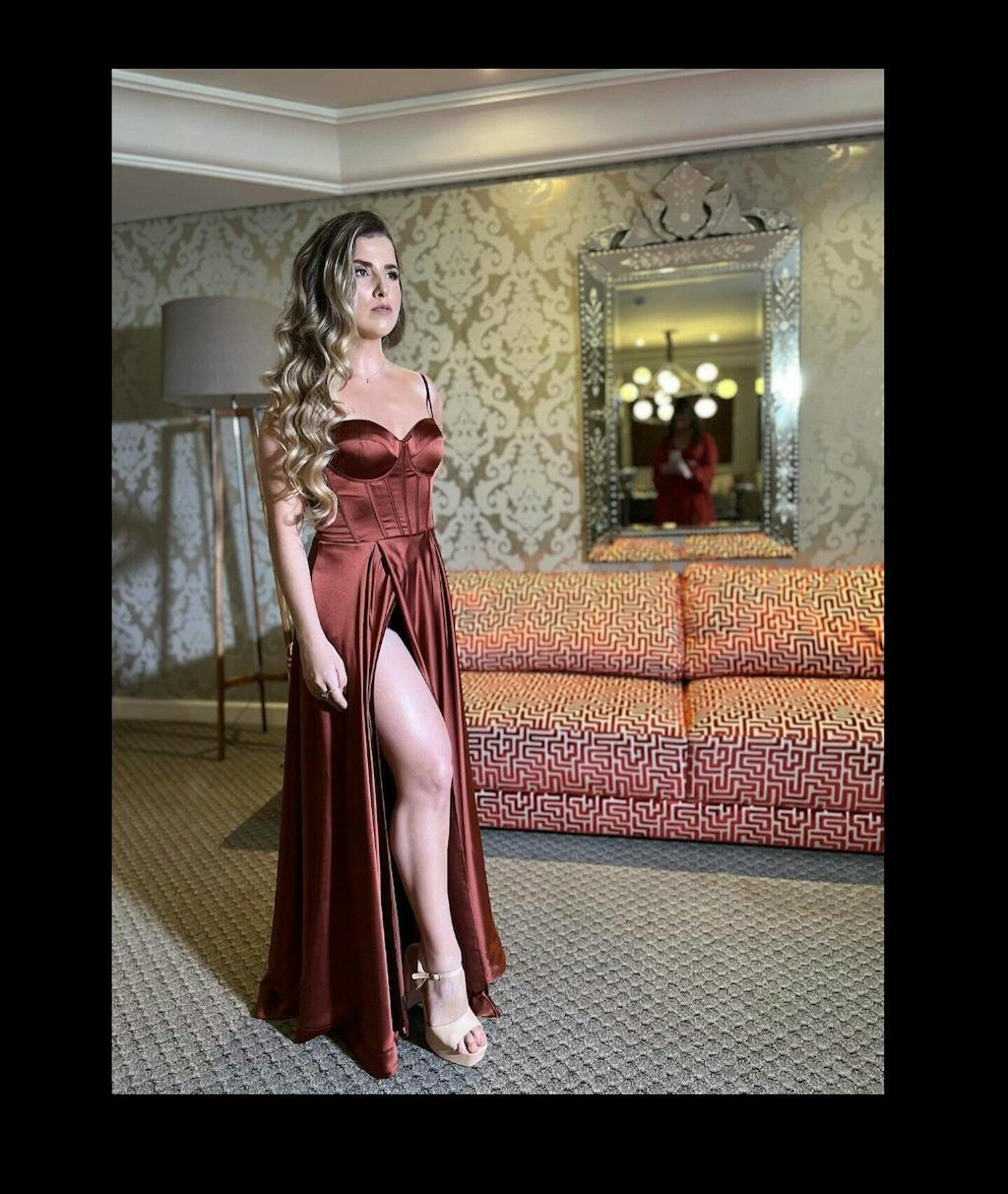 -Expertly crafted with charming A-Line silhouette and smooth satin fabric. -Elegant sweetheart neckline and sleeveless design for a timeless look. -Delicate ruffle detailing and a sultry split front add a touch of enchantment. -Perfect for prom, formal events, or any special occasion.