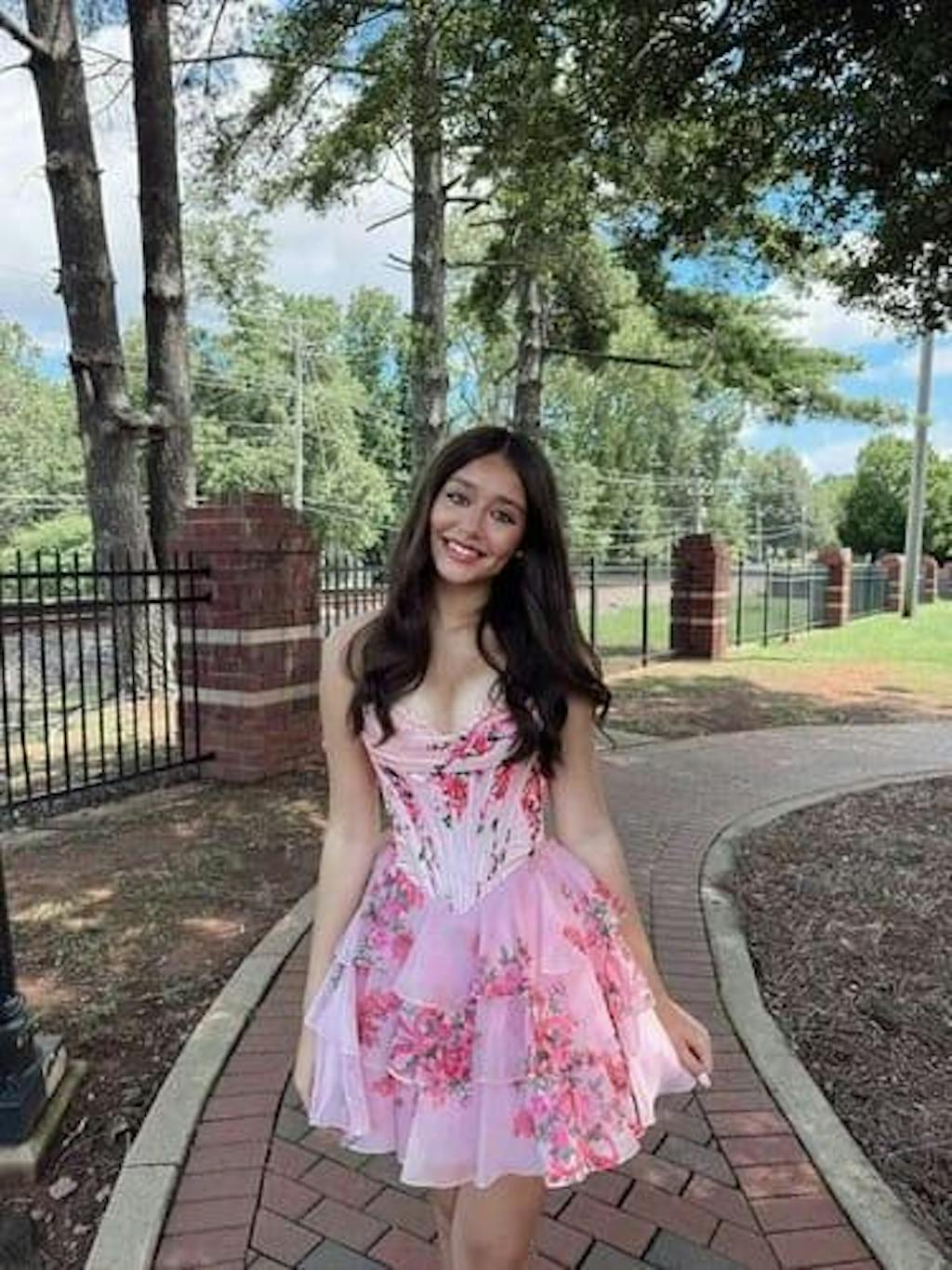 Featured: Sweet, flirty, and effortlessly charming — this blue homecoming dress features a flattering corset style bodice with a romantic sweetheart neckline. The soft A-line silhouette and playful tiered skirt create beautiful movement, while delicate floral patterns add a fresh, feminine touch. A perfect pick for making picture perfect memories at any party.