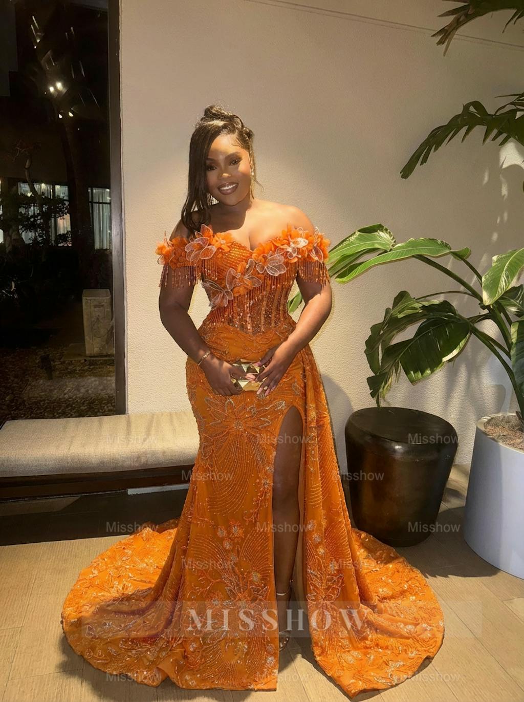 Captivate the room in this stunning orange mermaid gown, designed for those who command attention. The off-the-shoulder neckline frames your silhouette with timeless elegance, while intricate lace detailing adds sophisticated texture throughout. A dramatic front slit provides movement and modern flair, perfect for dancing the night away. The fitted mermaid silhouette hugs your curves before gracefully flaring at the hem, creating a show-stopping finish. Ideal for prom, galas, or formal evening events where you want to make an unforgettable impression.