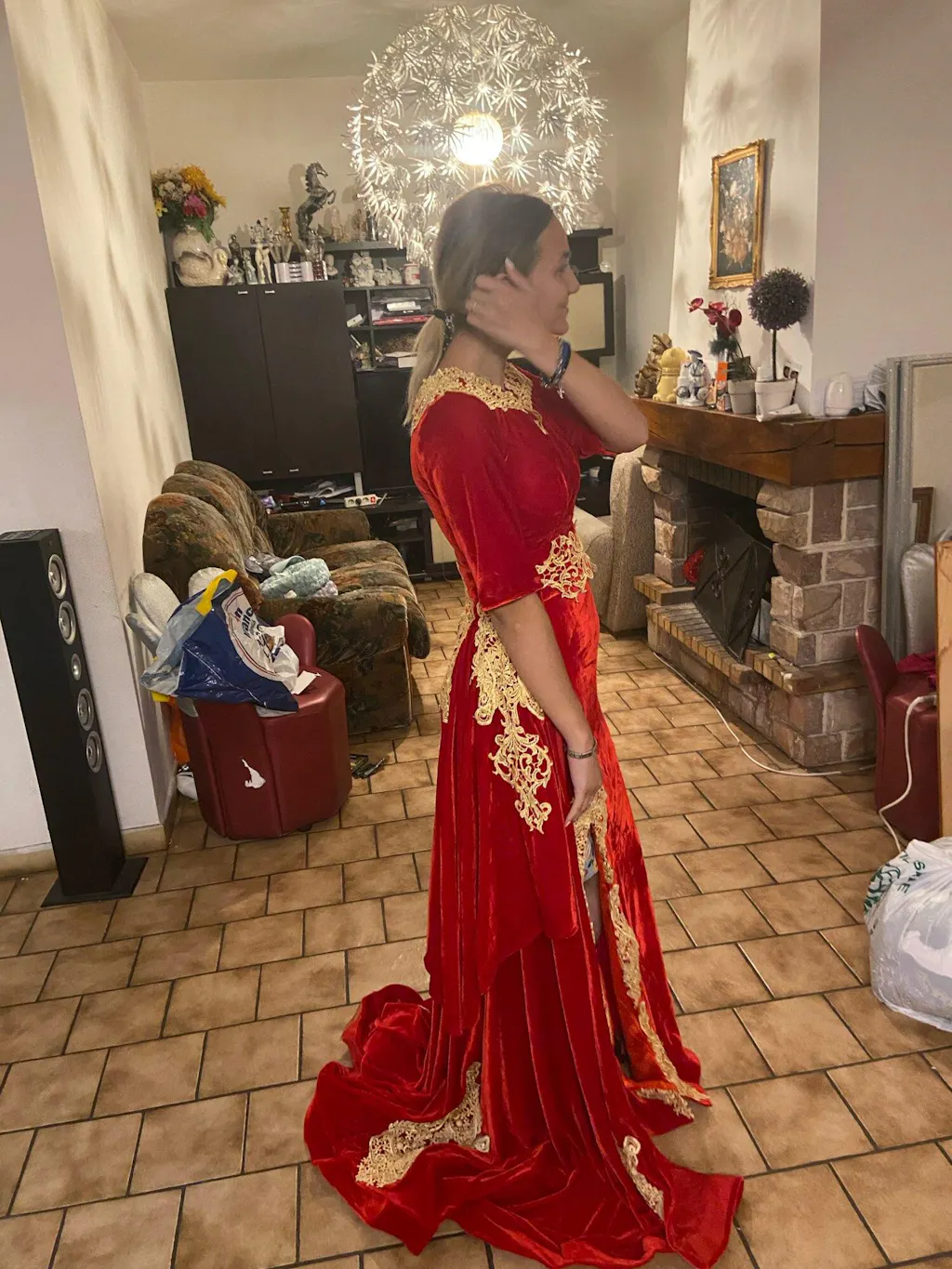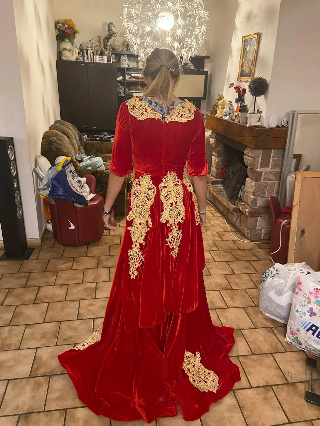 Gorgeous Halter Red Velvet Mermaid Evening Gown with Gold Appliques Half Sleeves