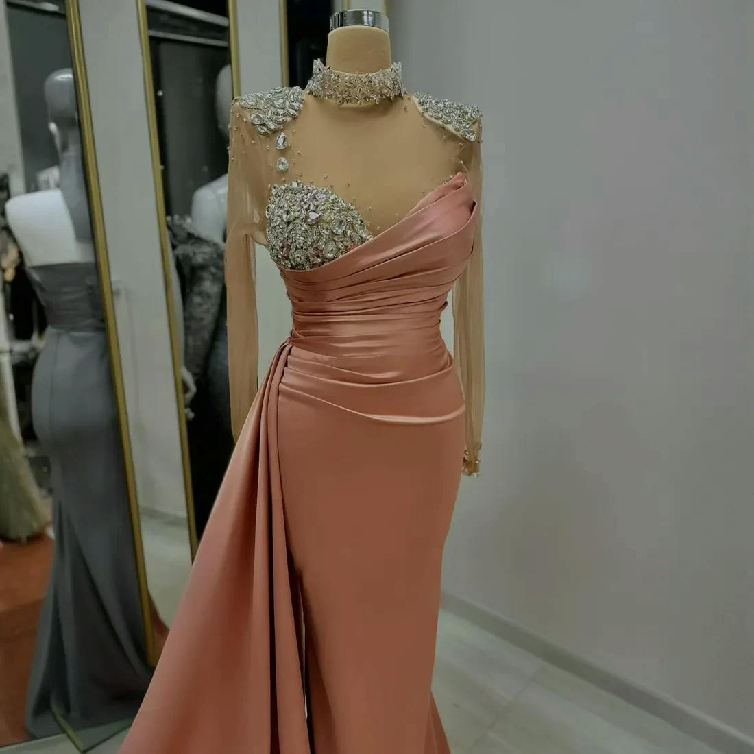 This elegant Mermaid Floor-Length Prom Dress is designed with a flattering high neckline and long sleeves, adorned with intricate beadings for a touch of sparkle. The dress is made of high-quality stain fabric and features a mermaid silhouette with ruffle detailing for added drama. Perfect for any special occasion, this dress will make you feel confident and beautiful.